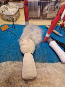 Man börjar alltid en docka med själva huvudet som från början bara är en liten nåltovad boll av finull. När den har fått en viss storlek är det dags att forma själva huvudet. Just nu ser det inte mycket ut för världen. Huvudet behöver få en ännu större form där ögonen möter pannan. Bakhuvud / nacke ska formas och därefter kinderna, hakan, näsan. Till min hjälp har jag markerat med en bomullstråd linjen mellan kinder/panna = ögongloberna och mitten på huvudknoppen.