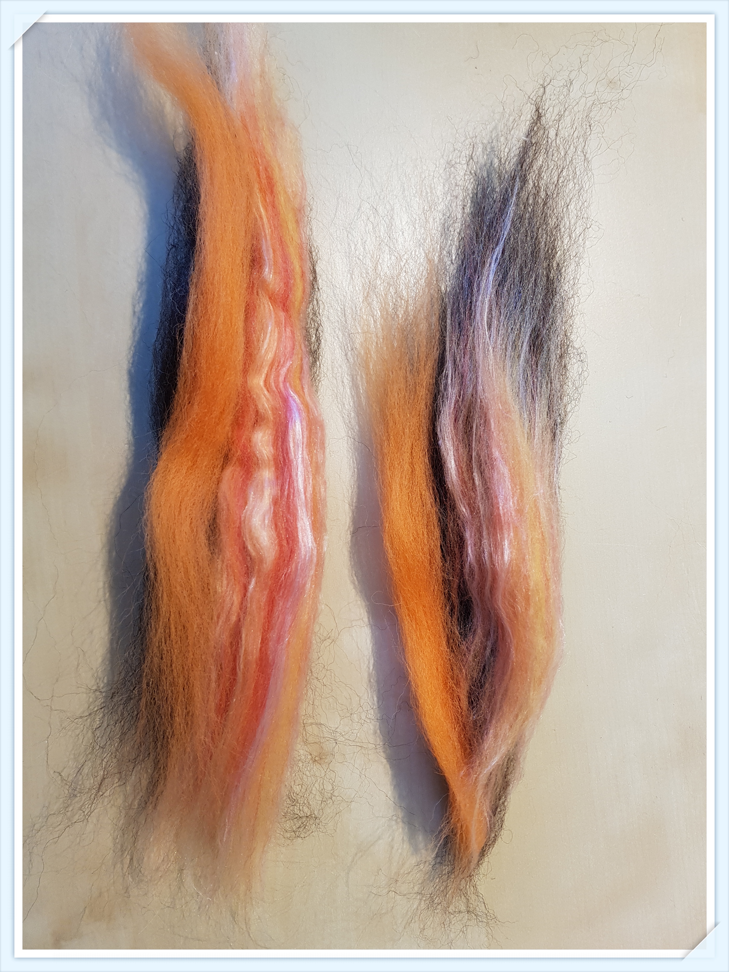 Genom att dra i sär ullen och lägga ihop den blandas färgerna, ju fler gånger desto bättre blandat.