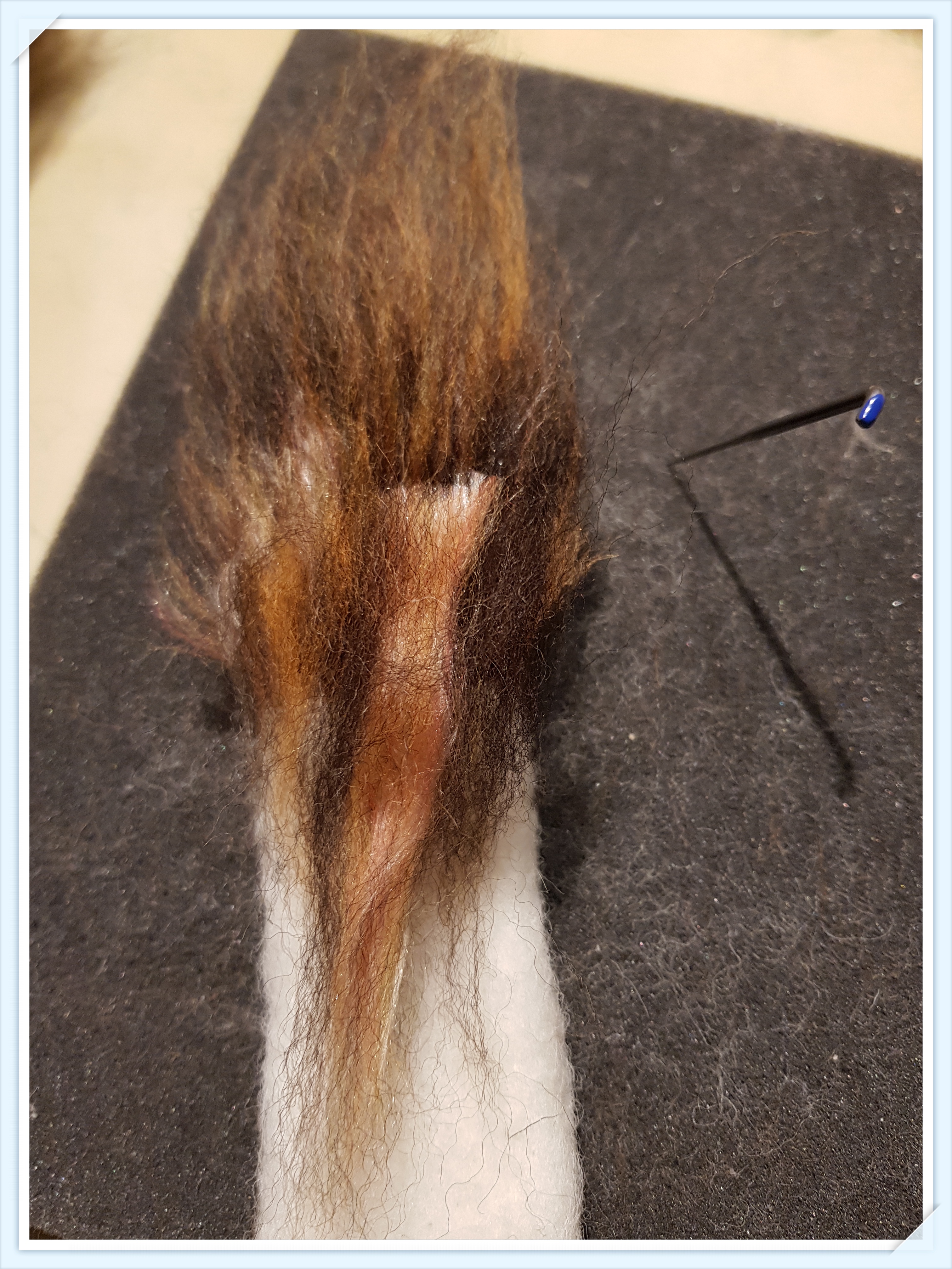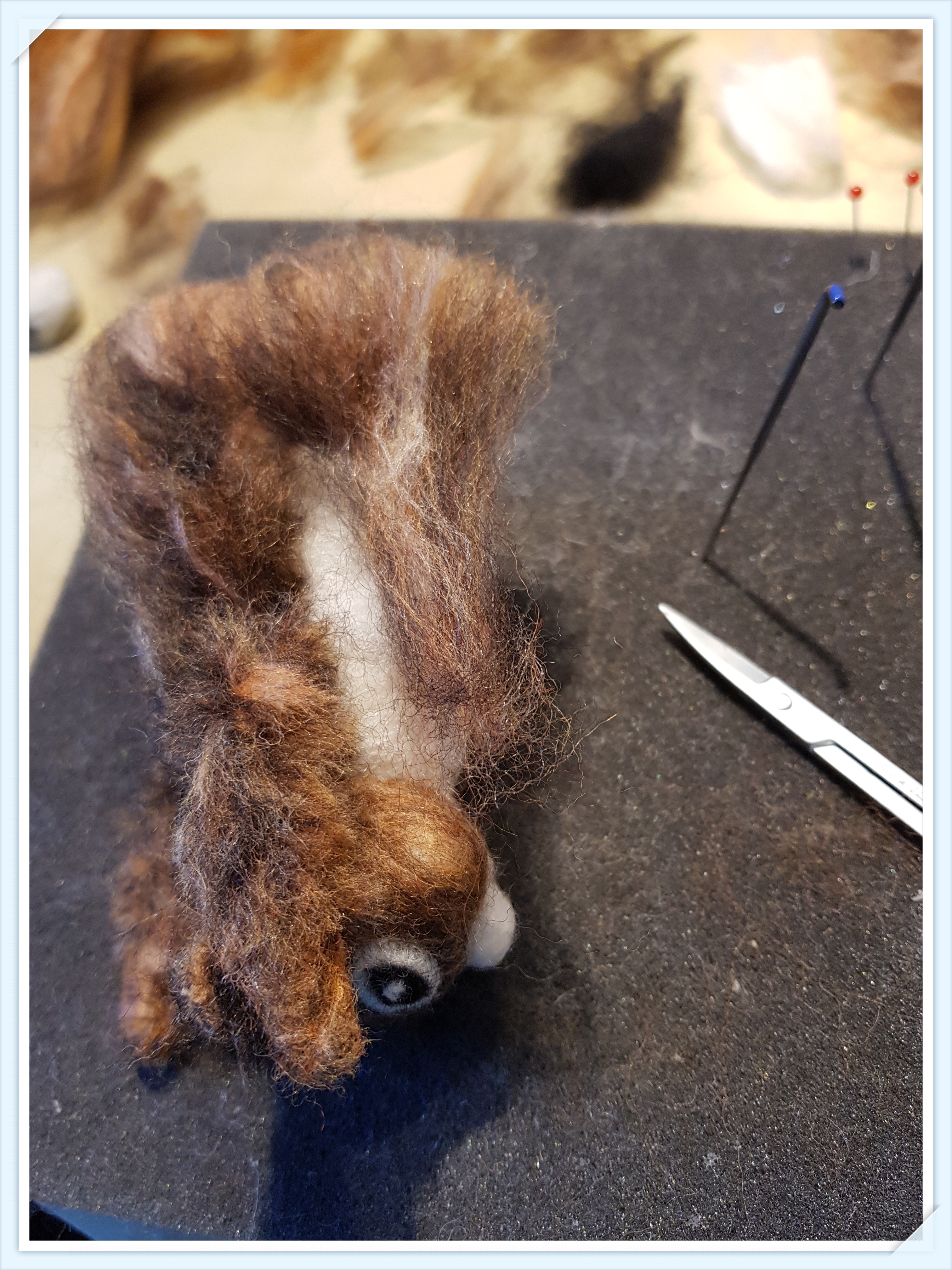 Med nålen ”kammar” jag ut ullen så att den slätas ut en aning och klipper bort det som blivit lite för långt.