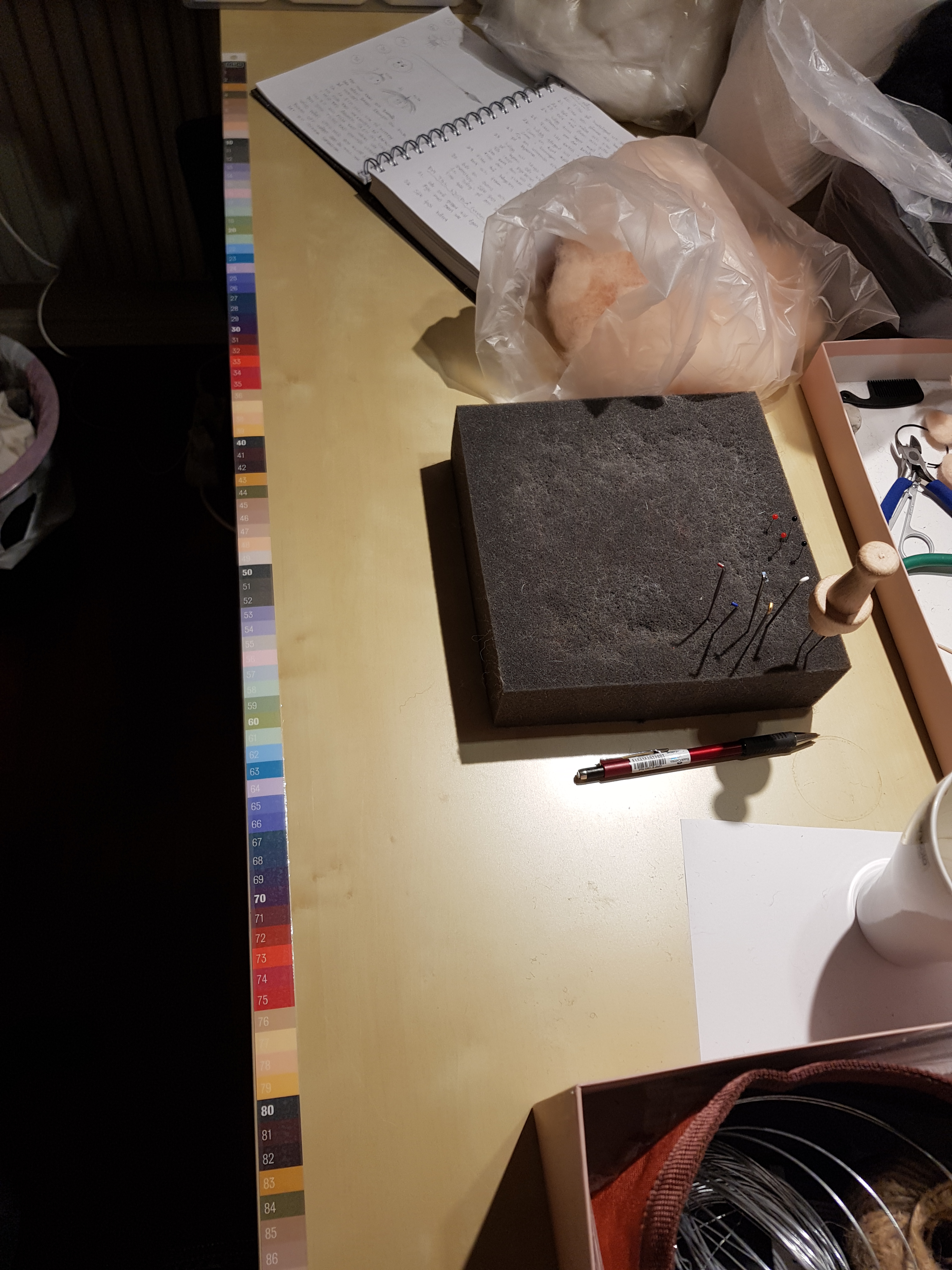 Solen skiner, musik i mina öron och jag jobbar vidare med Bockarna Bruse nr 3. 😃Det kom ett paket i brevlådan idag. 4 påsar med mullbärssilke! Jag blir glad av alla sprakande färger. Nu kan det bli mer glans i hår och päls på mina tovade alster. 😃Hittade ett färgsprakande måttband i min låda. Eftersom jag ofta mäter olika längder på ull och ståltråd fick jag en idé! Nu har jag tejpat upp måttbandet på bordskanten, så slipper jag ha det runt halsen. 😃