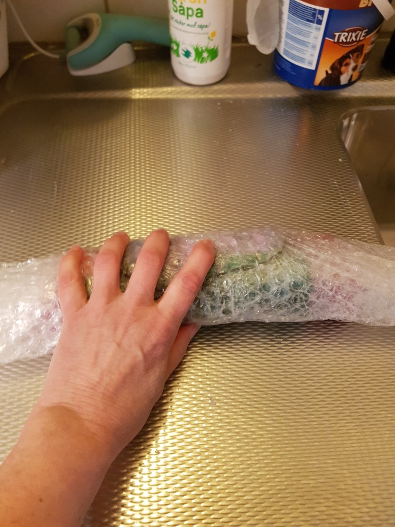 När allt var riktigt våttovat var det dags att rulla grodan flera gånger åt alla håll och kanter och sedan skulle den bada och torka.