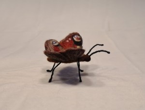 Klurade länge på hur jag bäst skulle få ihop alla vingar, ben och spröt med kroppen. Med tunn koppartåd som skelett blir det pilligt att tova med nålen, det är så lätt att dunka ner nålen i koppartråden. Till slut fick jag ihop allt i alla fall och fjärilen dekorerades med lite päls på kroppen.