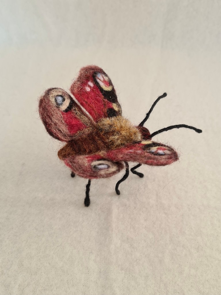 Nöjd och glad är jag över resultatet på min allra första tovade fjäril……men……upptäckte att det faktiskt saknas något….. ett benpar!😩