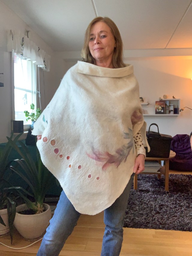 Det andra projektet är en våttovad poncho. Tidigare har jag prövat nunotovning, då man tovar fast ull på silke- eller sidentyg, men den här gången ville jag bara använda ull. Jag skissade upp hur ponchon skulle se ut och funderade länge på hur jag skulle våttova den utan att behöva sy i den. Jag beslöt mig för att använda en mall och rita av den från en virkad poncho jag hade. Sedan måste man göra mallen betydligt större eftersom ullen krymper.