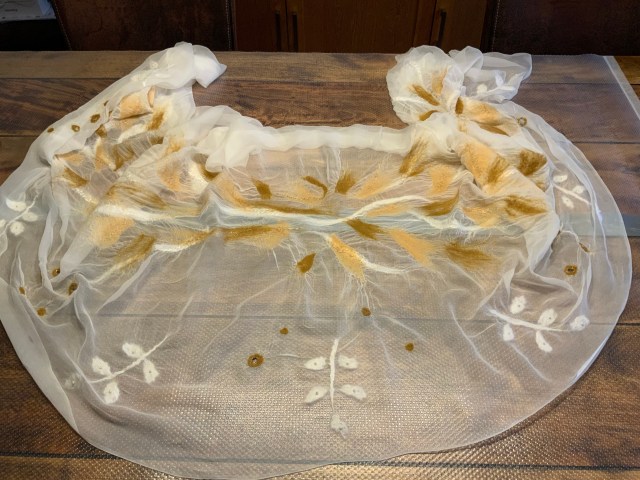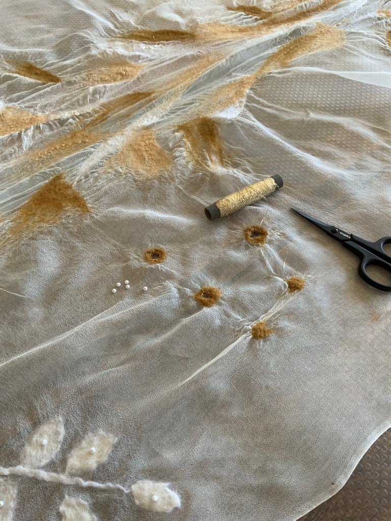 En tunn nunotovad chiffongsjal torkar väldigt fort. Efter sista badet rullade jag in den i en frottehandduk och strök den lätt. Sedan kunde jag fortsätta arbetet med att sy fast små pärlor och dekorera de små hålen med tunn guldtråd.