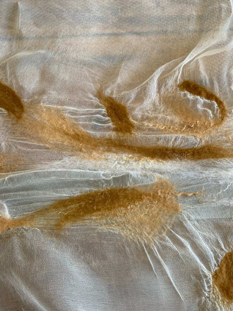 Jag köpte vit sidenchiffong, mullbärssilke och merinoull i nyanser som matchar varandra.