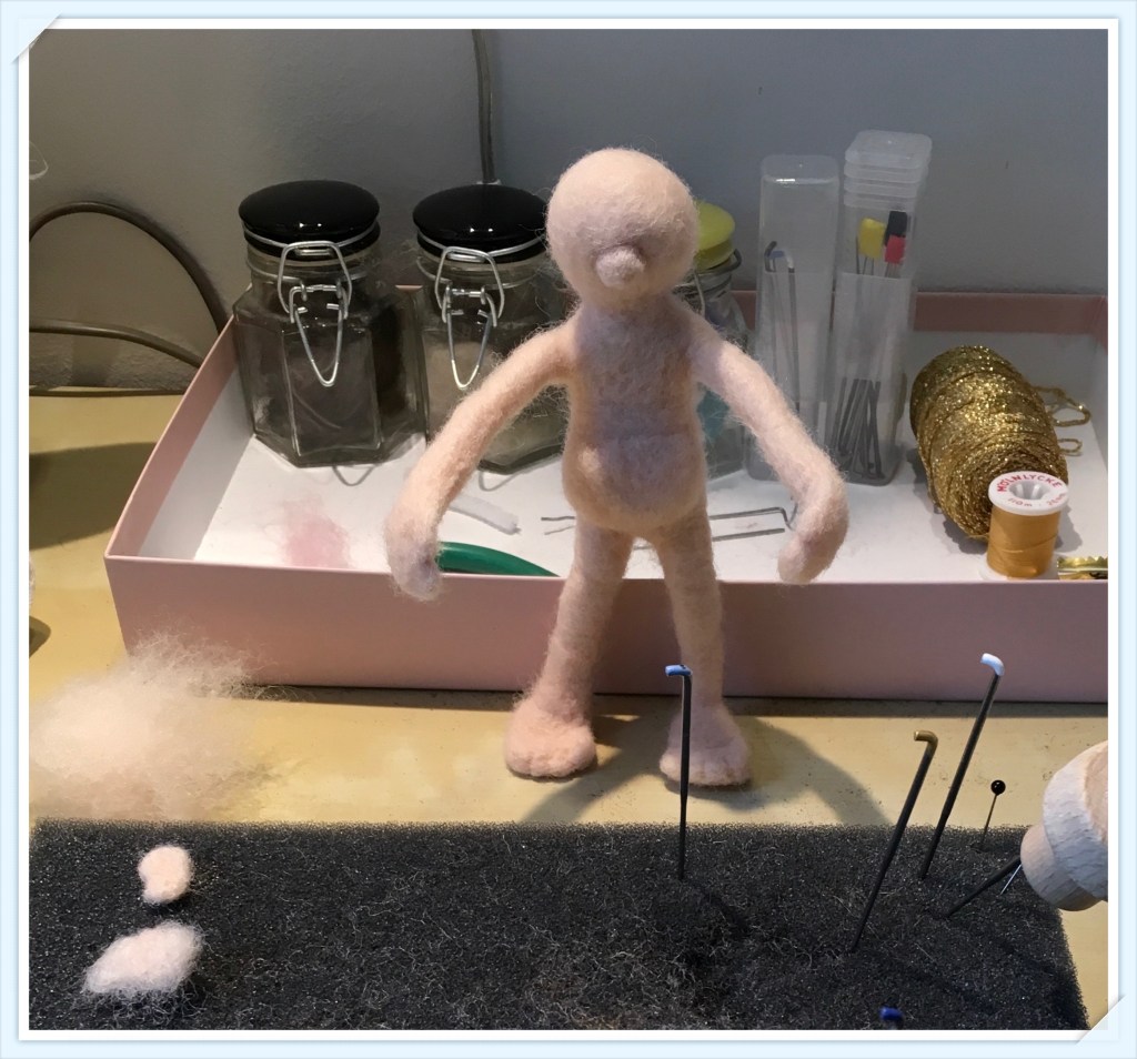 Nu är det dags för nästa figur i sagan. Huvud och kropp är monterade och efter det var det dags för att skapa lite kläder. Jag våt tovade tre små tygstycken som nu ligger på tork.