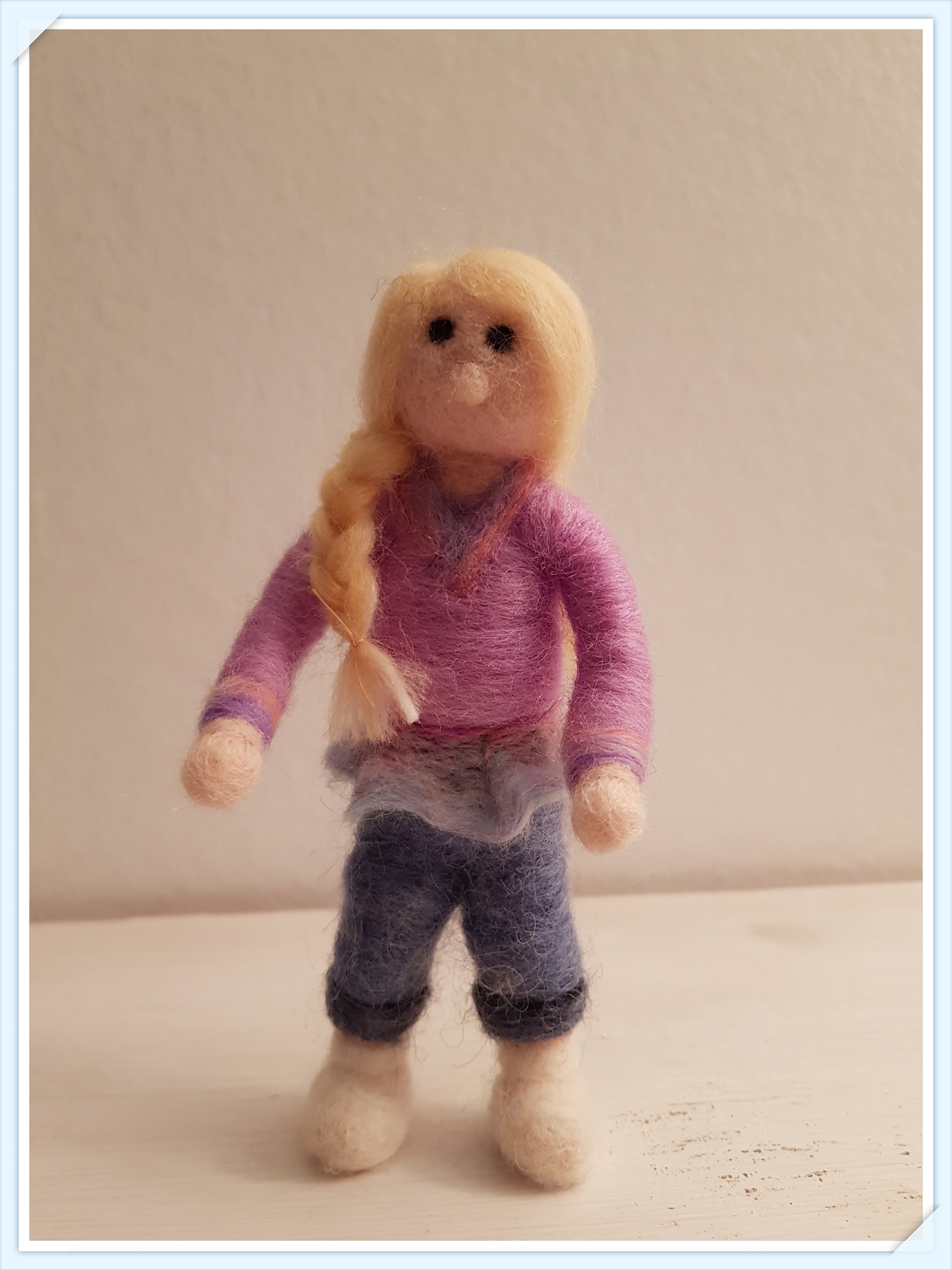 Resultaet blev en liten flicka. Jag våt tovade också en liten ullremsa i ett försök att göra en liten volang som avslutning på tröjan.