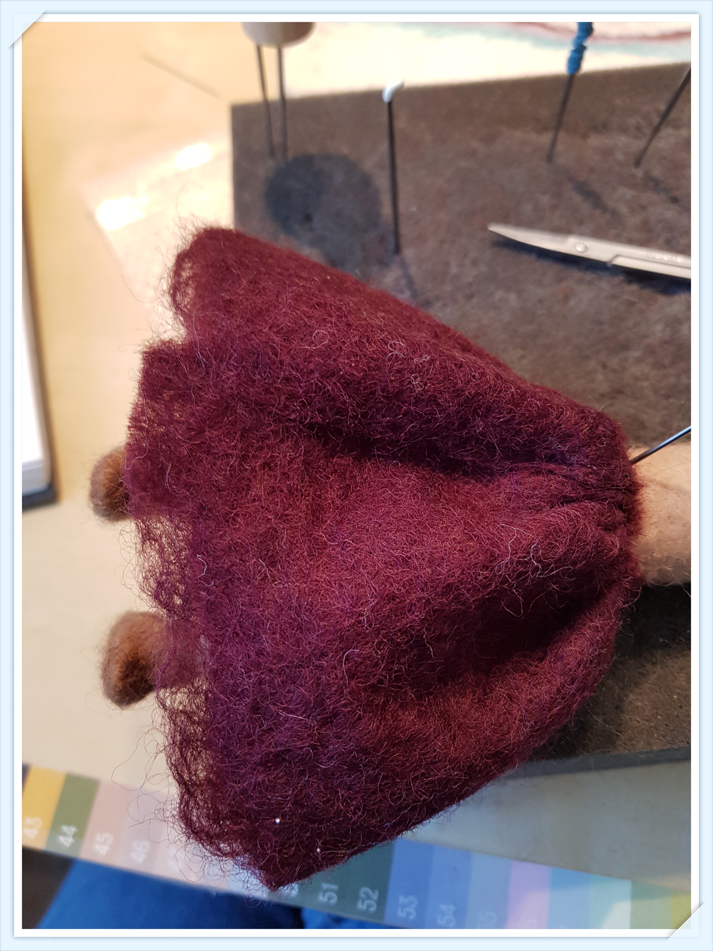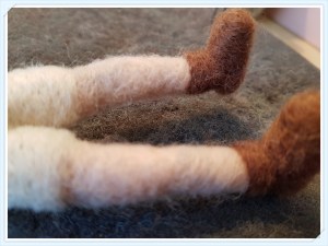När ullen är tovad, blir den som filt och det går att både klippa i den och sy. Skor däremot får man tova direkt på foten, i alla fall i den här lilla storleken.