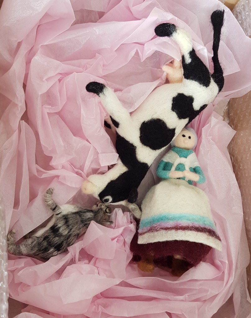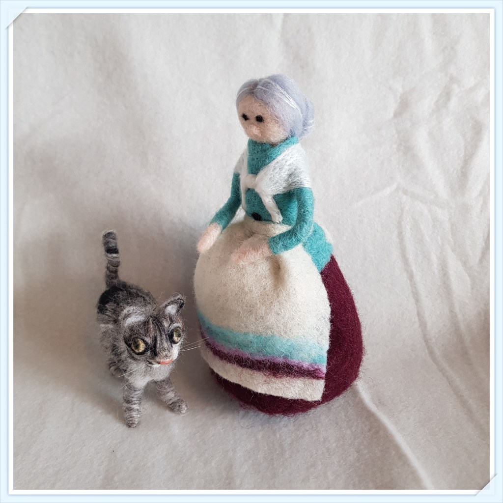 Jag våt tovade lite ull att skapa kläder av, små kläder till en ny liten figur. Idag var det dags att bli sömmerska!