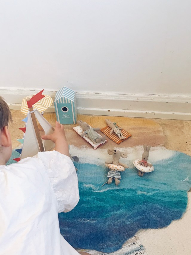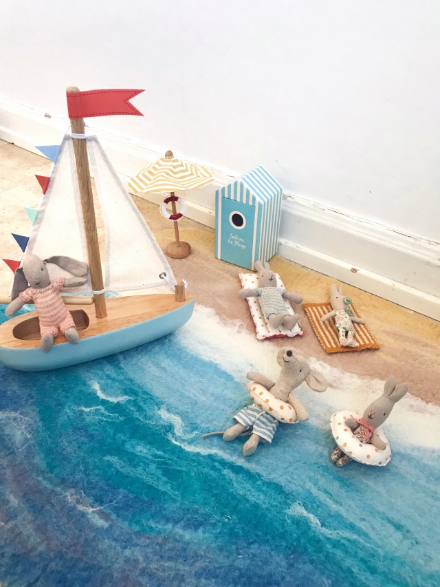 Lekmattan har nu anlänt till sin rätte ägare och den har testats i leken den här helgen. Båten seglar på havet. ⛵️Möss och kaniner badar och solar sig på stranden.🏝 Parasollet är uppsatt och badhytten på plats. ⛱