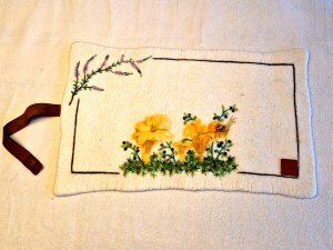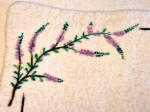 När dynan är redo kommer den färgade ullen fram och tovnålarna. För att få fram rätt nyanser blandar jag en mindre mängd ull på kardbrädan. Efter fler timmar med ull-målning är det dags för en ny omgång våttovning, fast nu endast på de nåltovade motiven. Torka och stryka.