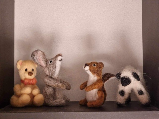 Det har varit vovvar i miniformat, mellan format och större format. Jag har fått äran att tova en katt och andra djur, både nya och nygamla. Även några figurer och dockor har sett dagens ljus, med våttovade tygstycken till kläder. Lite återbruk blev det när två gamla glasburkar förvandlades till ull lyktor.