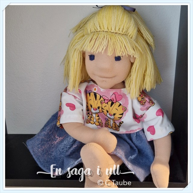 Handdockan har nu fått ett par byxor och ett par hängslen. Händer och fötter är fyllda med lite ull och nåltovade lätt för att forma till dom. Han har också fått ett fluffigt och spretigt hår och så en fin svans förstås.
