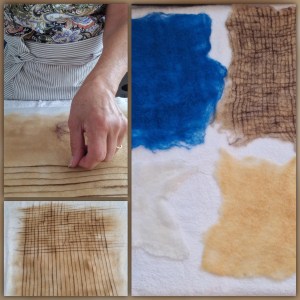 När grundtyget är lagt och tovats lätt, drar jag ut tunna strängar av brunt ull, ca 1 cm mellan raderna. När tyget är färdig tovat har rutorna krympt ihop en aning.