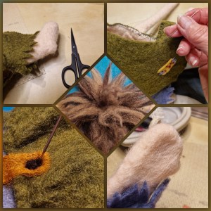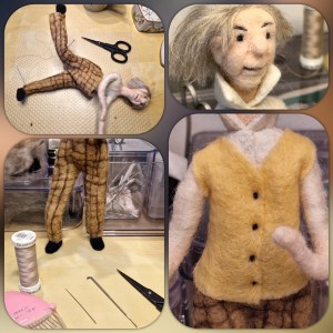 Dagen efter plockas mina mönstermallar fram och tovningsdynan byts ut mot nål och tråd. På några ställen använder jag tovningsnålen , ex för att sätta fast byxlinningen runt midjan.