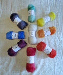 Alla är färgade i ”standardfärg”, dvs jag har inte blandat några färger med varandra. Eftersom de första nystanen blev färgskiftande, fortsatte jag så med alla 8 färger. ( Förutom den vita förstås, den är naturligt vit rakt igenom).
