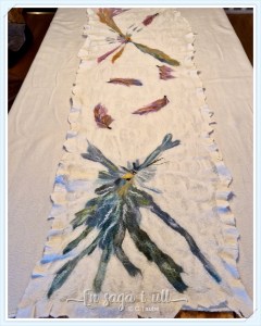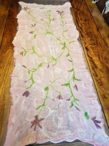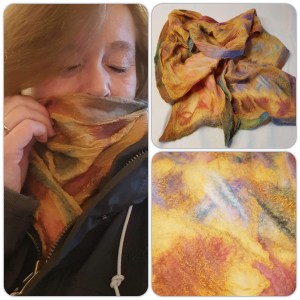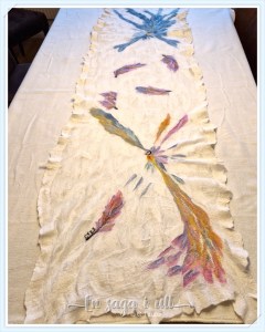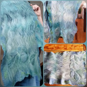 Nunotovad sjal i merinoull med olika silkesfibrer på vitt silkestyg. Art design på framsidan med tunna ulltussar på baksidan.