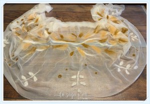 Sydda små hål i guldtråd samt små pärlor som dekor på bladen.