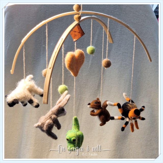 Till ett litet barnbarn beställdes en mobil att hänga ovanför skötbordet med olika djur att sjunga visor om.