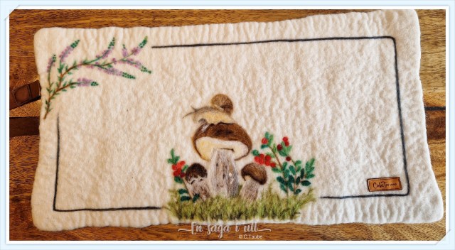 Sittdynorna är först våttovade i svensk ull från Finullsfår. När dynan har torkat har jag nåltovat ett motiv på dynan, man säger att man ”målar med ull”. Efter det har jag våttovat lätt på det nåltovade så att det ska hålla bra.