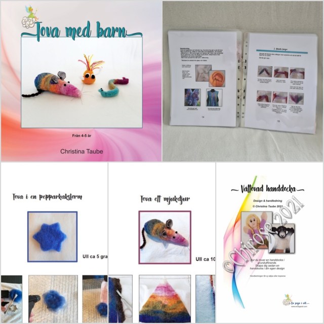 Vid sidan om alla beställningar har jag börjat på ett nytt handledningshäfte, TOVA EGNA SAKER, en fortsättning på TOVA MED BARN där man får prova på olika sätt att våttova. Tanken är att det nya häftet ska innehålla mer konkreta saker att våttova såsom tovade smycken, teatermasker, små gosedjur, enklare handdockor, nyckelringar etc Här kan du hitta kardad ull i mindre nystan, tillbehör och handledningar till TOVA MED BARN : Material till våttovning