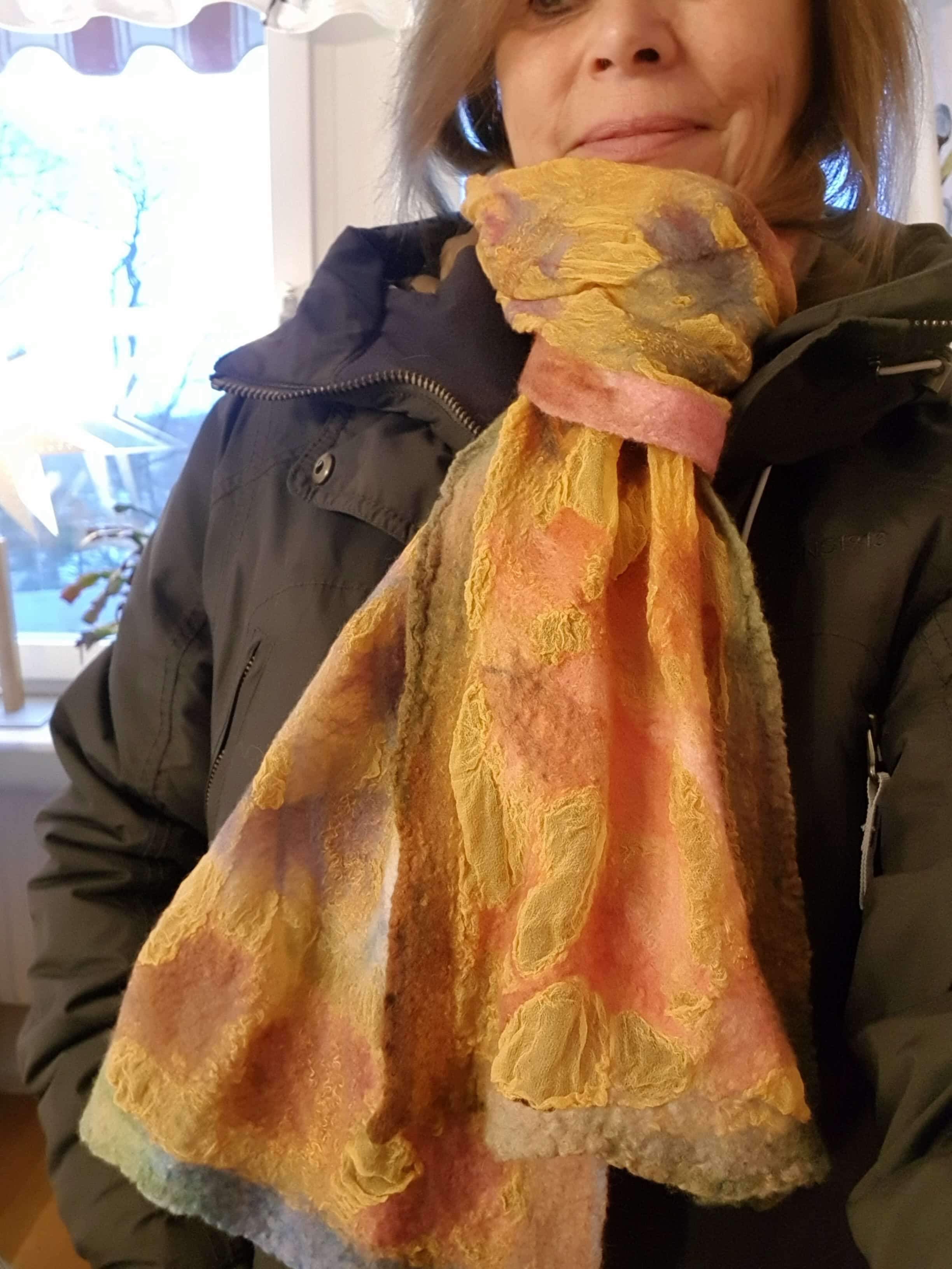 Jag är mycket nöjd med min nya sjal, som lyser upp i vintermörkret och ger värme när det är frostigt ute.