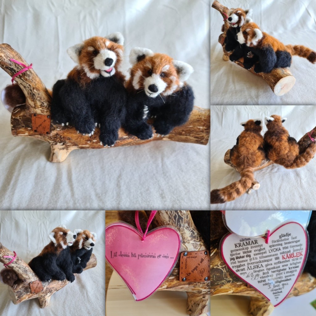 Som bröllopsgåva valde jag att ge något jag själv skulle uppskatta och som kan stå framme som ett minne från den här dagen. Jag tovade två röda pandor som sitter bredvid varandra på en gren. Dom ska påminna om att vårda kärleken och finnas till för varandra i vått och torrt.