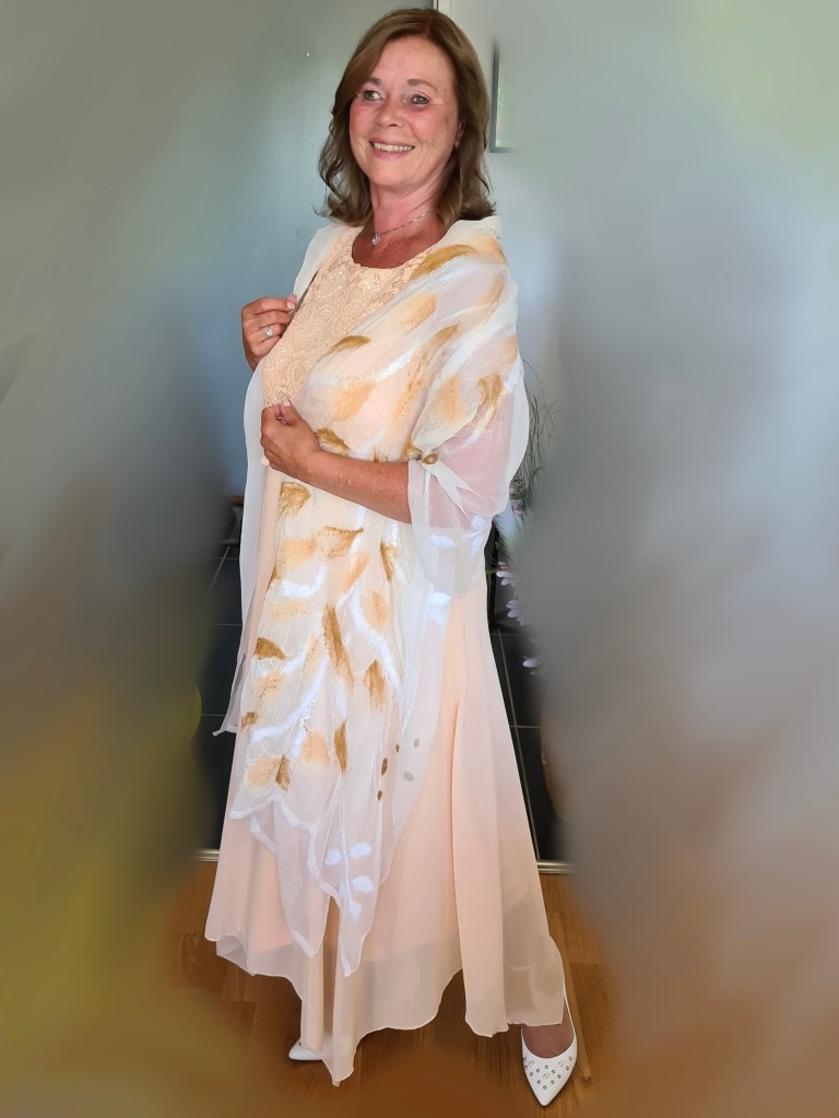 I år avslutar vi vår semester med ett härligt bröllop! Då blev det premiär för min sjal som jag tovade tidigare. Klädseln var nämligen ”elegant” för kvinnorna.