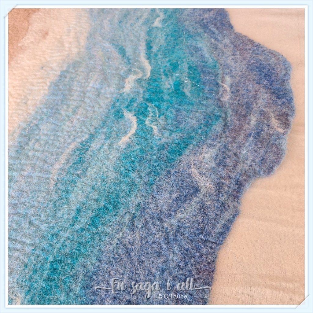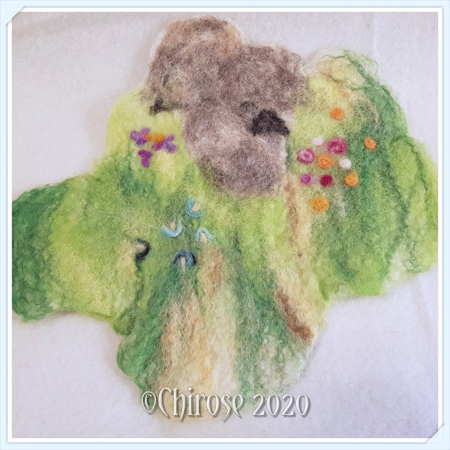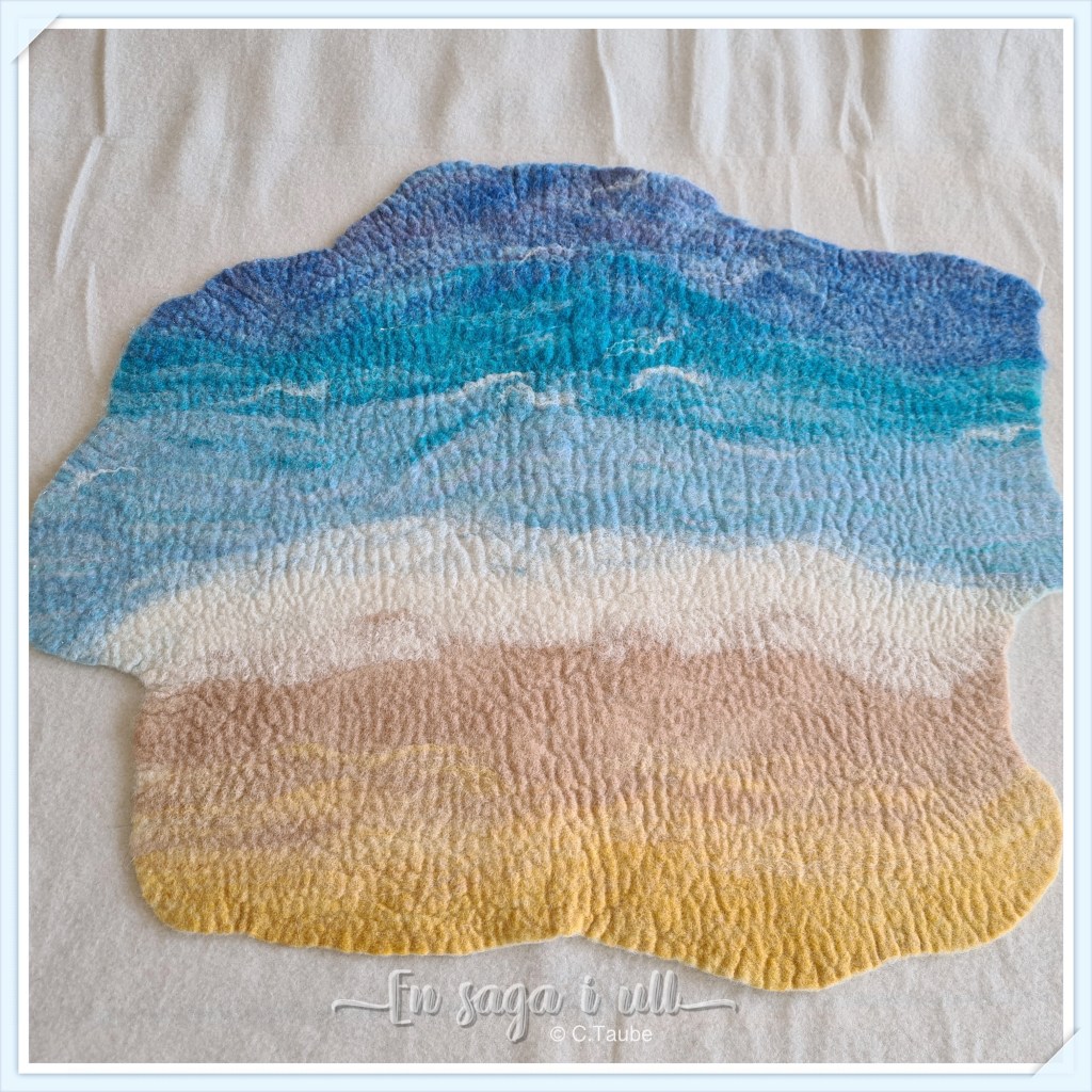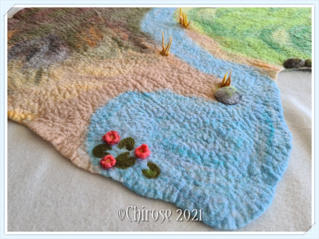 Mattan är våttovad helt i ull med nåltovade detaljer som stenar, blommor, vass och en liten mur.
