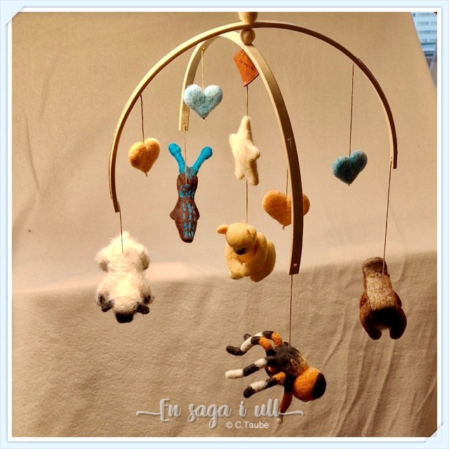 Här visar jag djur / figurer som jag har tovat till sångpåsar och barnmobiler.
